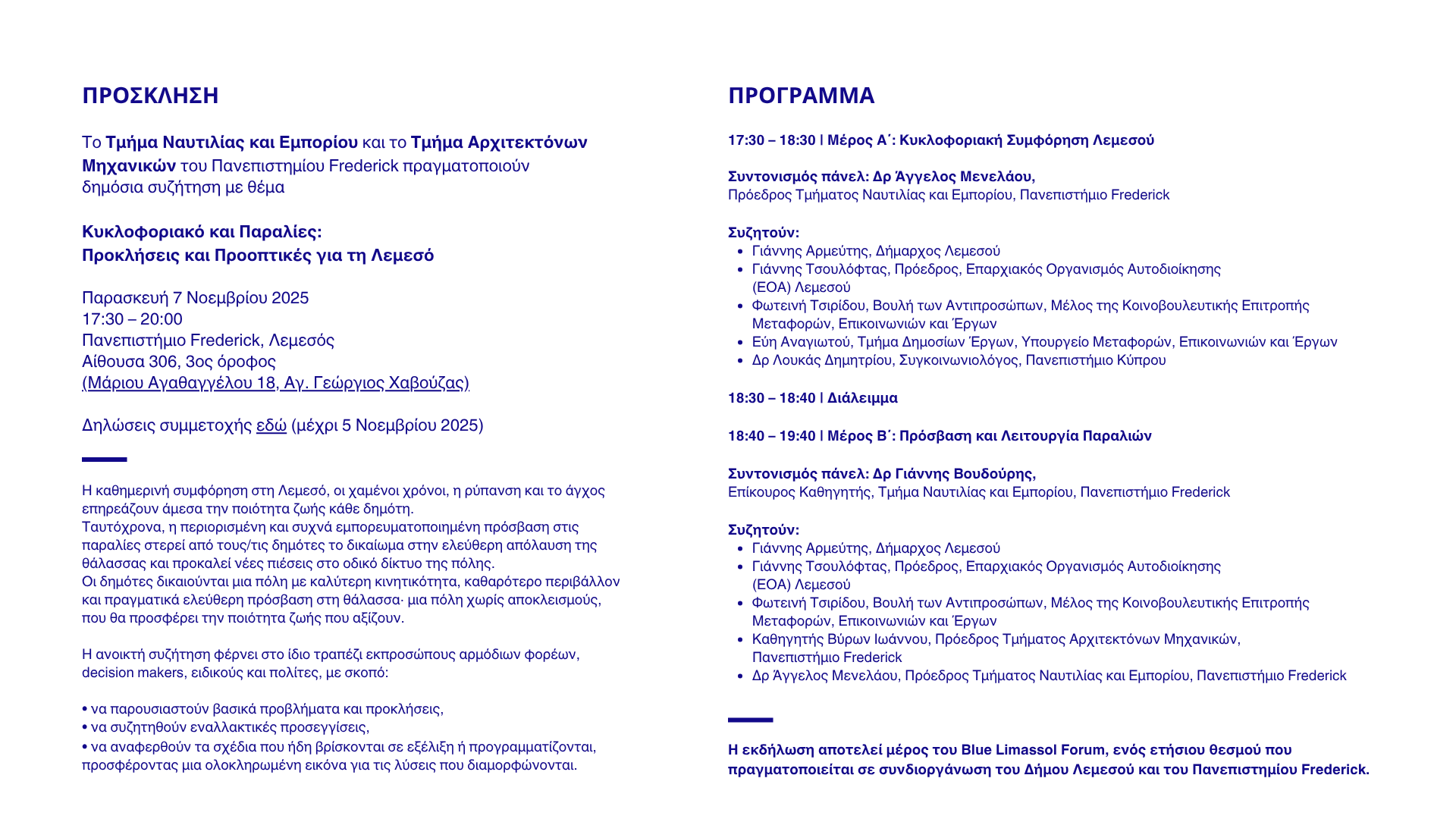 To Τμήμα Ναυτιλίας και Εμπορίου και το Τμήμα Αρχιτεκτόνων Μηχανικών του Πανεπιστημίου Frederick πραγματοποιούν δημόσια συζήτηση με θέμα την κυκλοφοριακή συμφόρηση στην πόλη της Λεμεσού, και την ελεύθερη πρόσβαση στις παραλίες της πόλης.