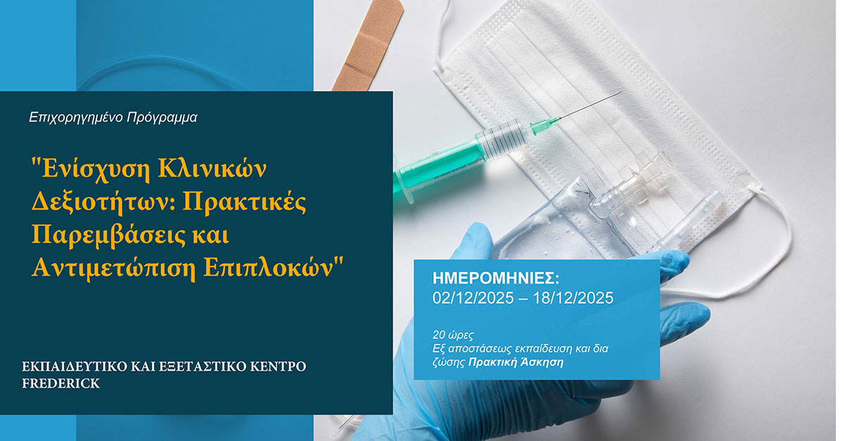 Το Εκπαιδευτικό και Εξεταστικό Κέντρο Frederick διοργανώνει το εκπαιδευτικό πρόγραμμα κατάρτισης "Ενίσχυση Κλινικών Δεξιοτήτων: Πρακτικές Παρεμβάσεις και Αντιμετώπιση Επιπλοκών", επιχορηγημένο από την Αρχή Ανάπτυξης Ανθρώπινου Δυναμικού.